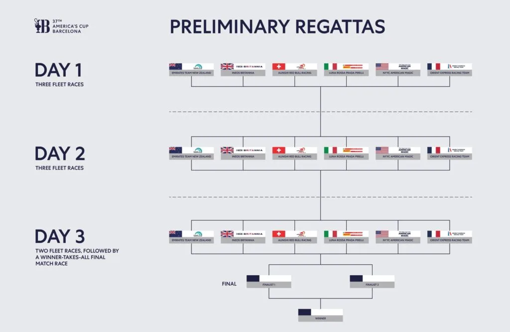 Están programadas hasta tres regatas preliminares, las dos primeras en la clase AC40 y la última, en Barcelona, en la clase AC75. Los detalles de las reglas, puntuaciones y condiciones se desvelarán cuando se acerque la fecha de la prueba.